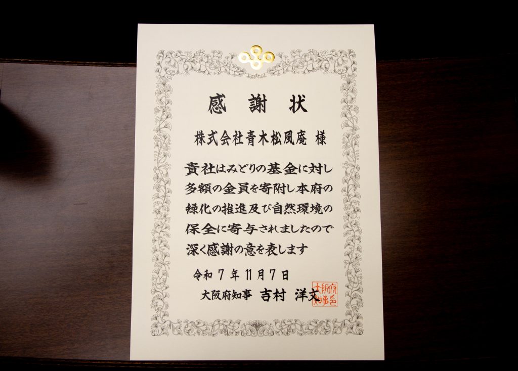 大阪府吉村知事より寄付に対する感謝状を頂きました。|青木松風庵